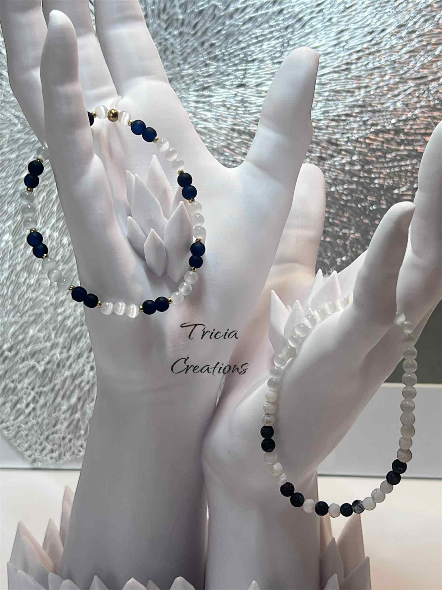 Duo de bracelets élastiques perles de 4mm, blanc et bleu foncé. Chaque bracelet mesure 17cm, offrant un ajustement confortable pour la plupart des poignets. Ces pièces minimalistes se portent seules ou empilées pour un effet plus affirmé. Parfaits pour compléter une tenue quotidienne ou créer une signature accessoire subtile et intemporelle.