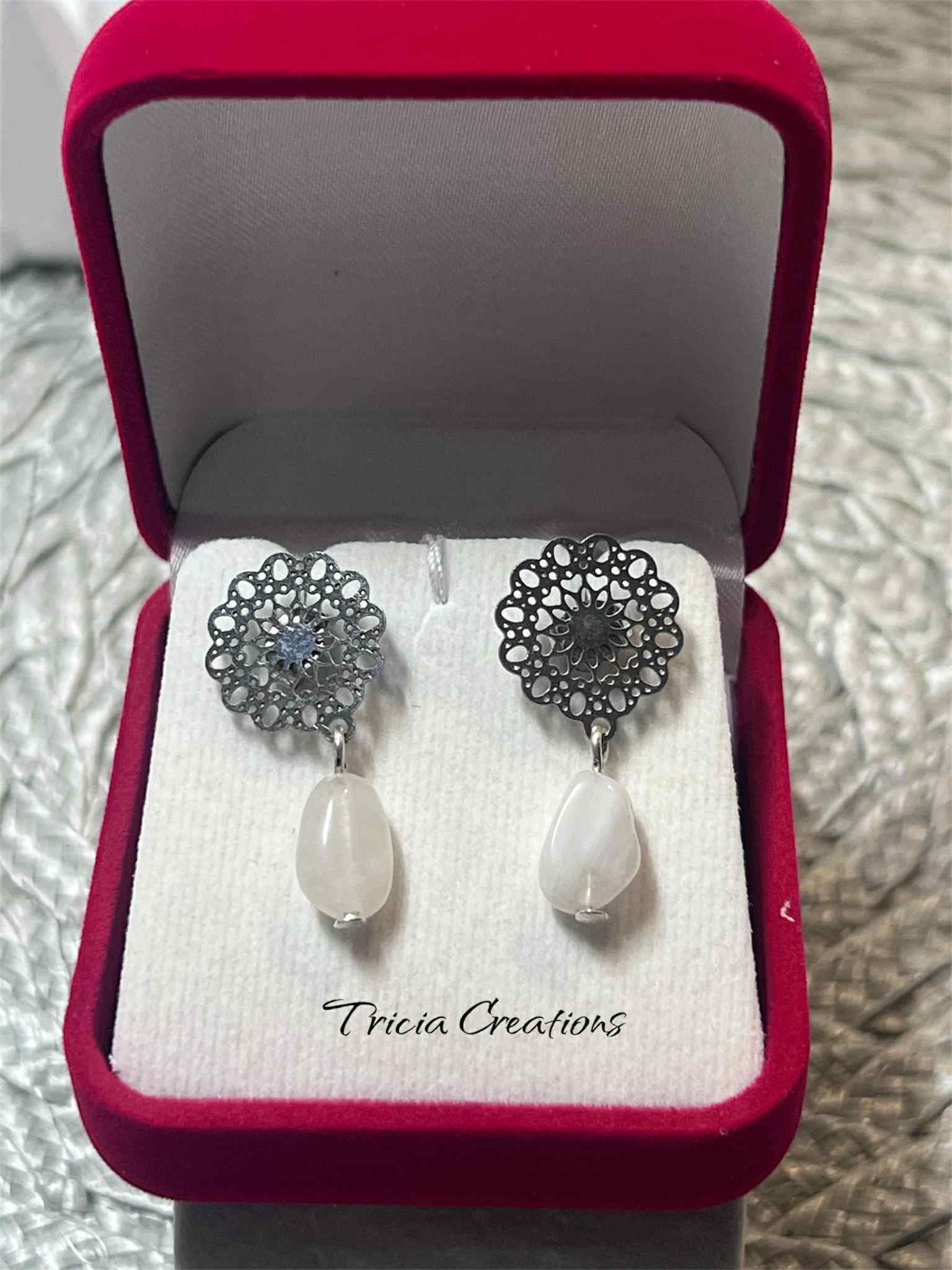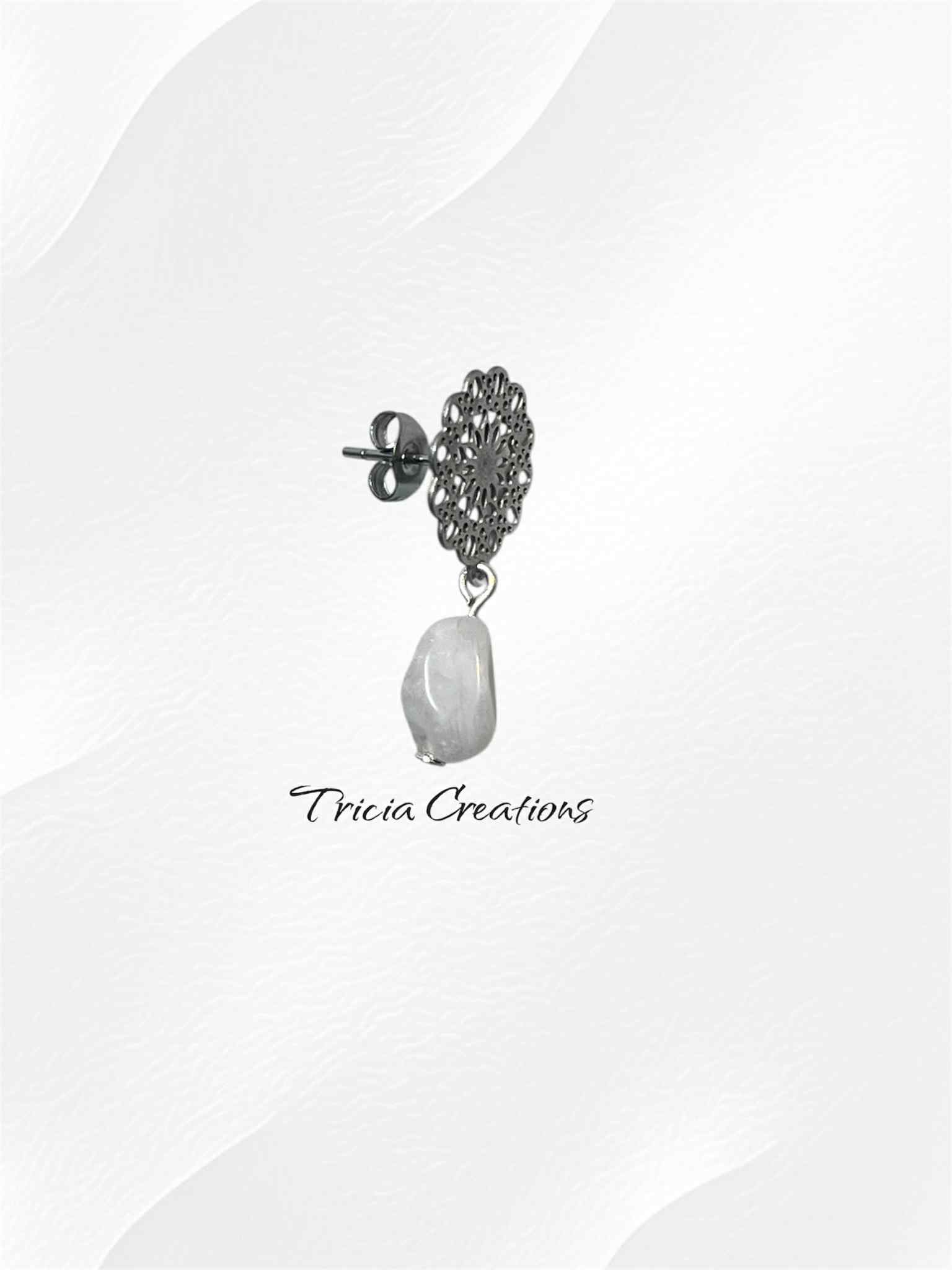 Boucles d'oreilles en acier inoxydable avec perles de pierre de lune. Le design pendant offre une silhouette gracieuse qui encadre délicatement le visage. La pierre de lune, réputée pour ses propriétés apaisantes, ajoute une touche de sérénité à votre style quotidien.