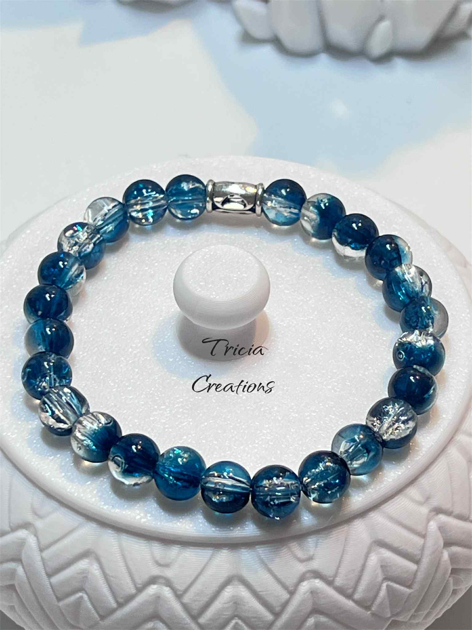 Bracelet élastique 17cm, confectionné avec des perles de verre bleu argenté de 8mm. Ce modèle épuré allie élégance minimaliste et polyvalence, s'adaptant à tous les poignets.