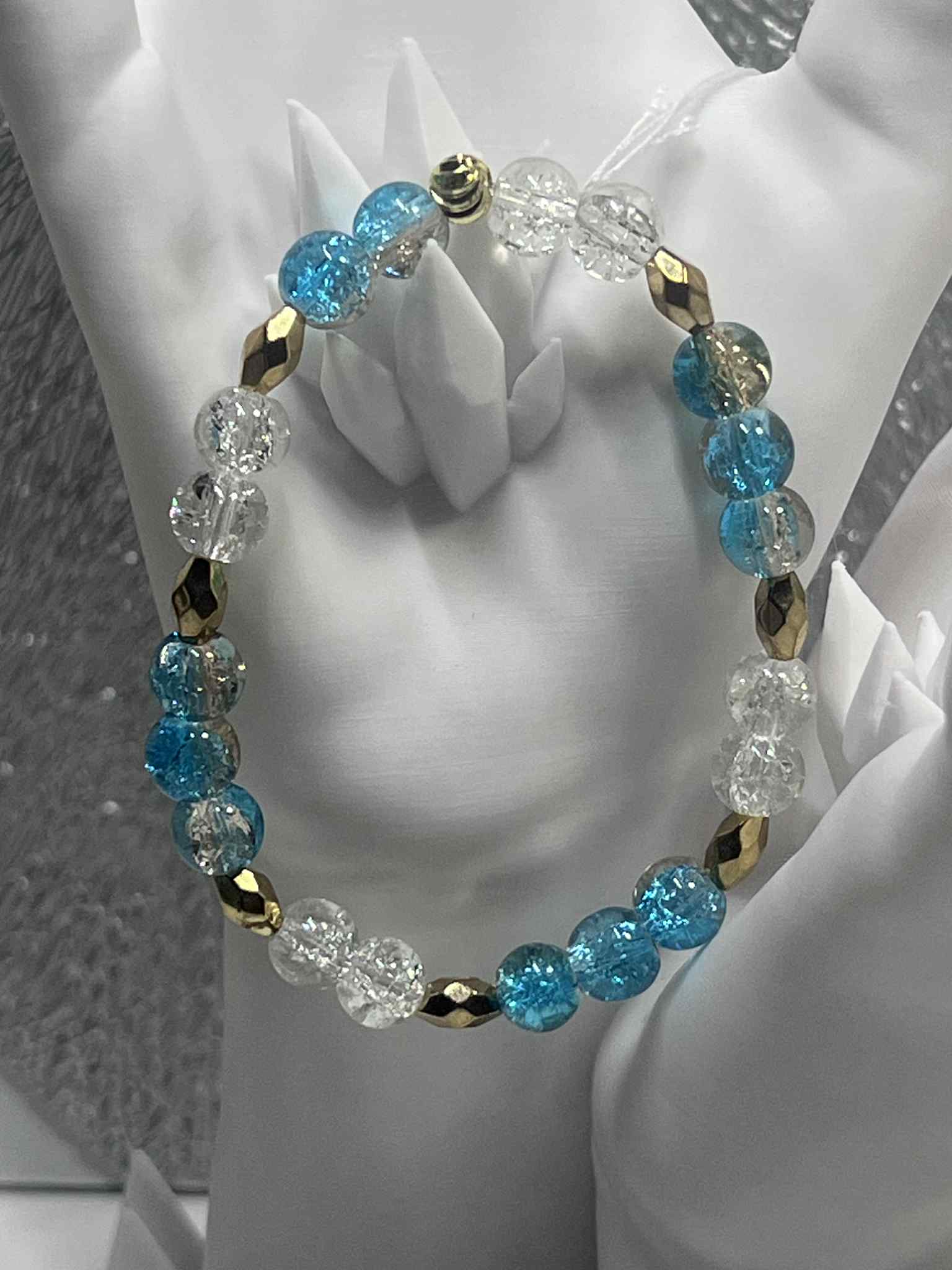 Bracelet élastique aux perles bleu et translucide avec effet craquelé, associées à des perles ovales facettées dorées pour une touche d'éclat. Conçu pour un tour de poignet de 16 cm, ce bracelet allie délicatesse et sophistication. Les perles craquelées créent une texture visuelle captivante tandis que les éléments dorés apportent une finition premium. Parfait pour compléter une tenue avec élégance ou offrir en cadeau.