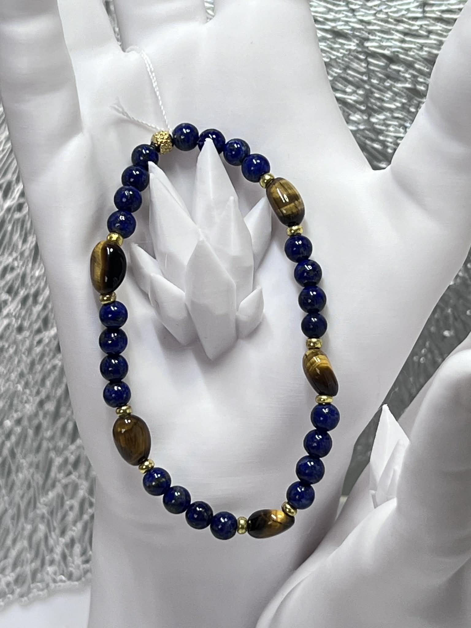 Ce bracelet élastique est composé de perles rondes de lapis lazuli de 6mm, de perles roulées oeil de tigre et de perles de rocailles dorées. Il mesure 16cm de tour de poignet et apporte une touche de style et de protection avec ses pierres naturelles.