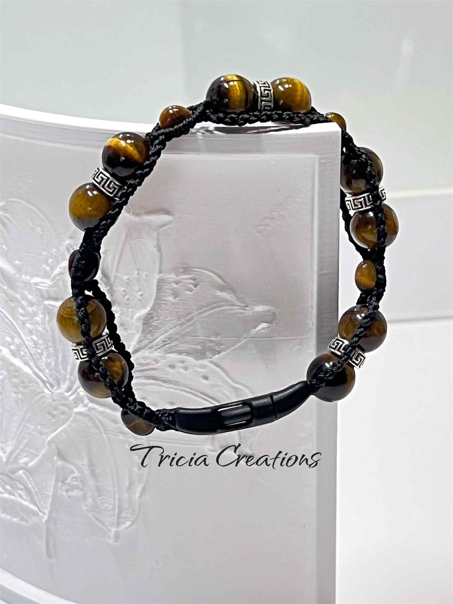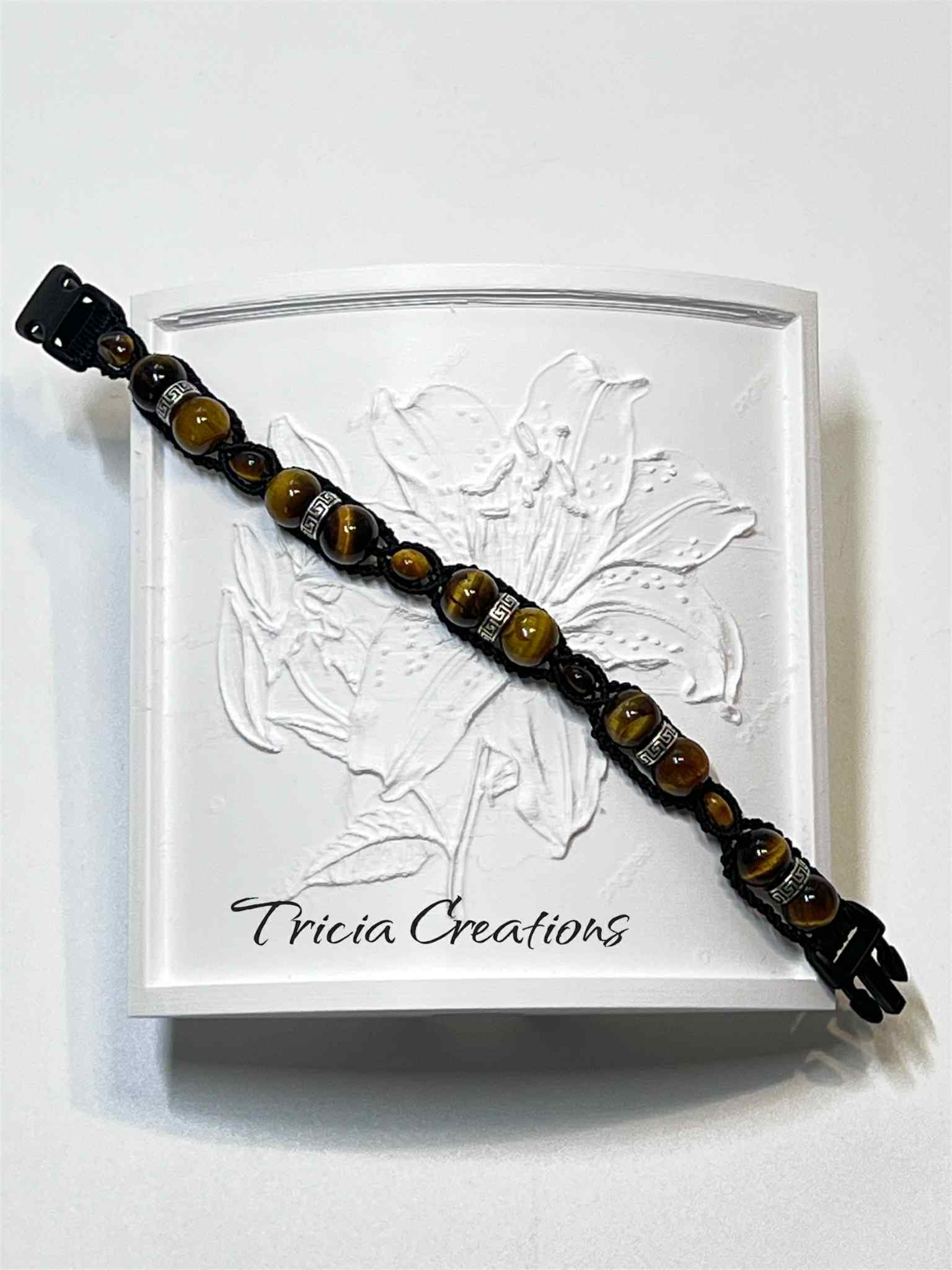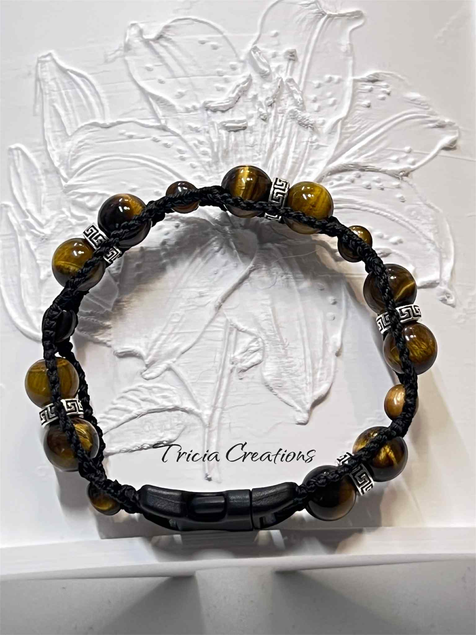 Bracelet micro macramé noir avec perles en œil de tigre, reconnues pour leurs propriétés protectrices et apaisantes, apportent une touche naturelle et élégante. Complété par des perles en acier inoxydable. Tour de poignet : 17cm