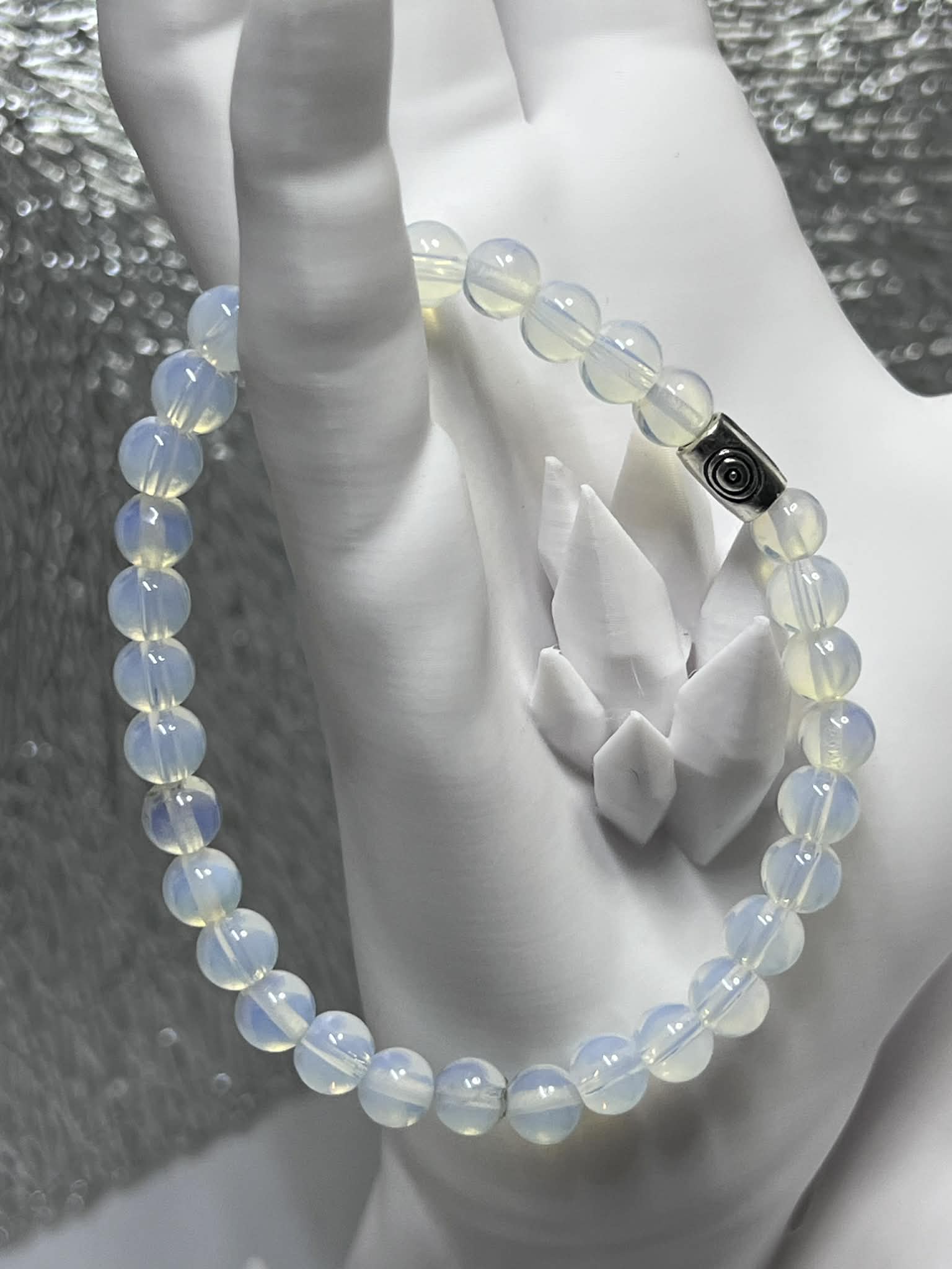 Ce bracelet élastique, perles en opaline synthétique de 6mm. Les perles d'espacement en acier. Tour de poignet de 16cm.