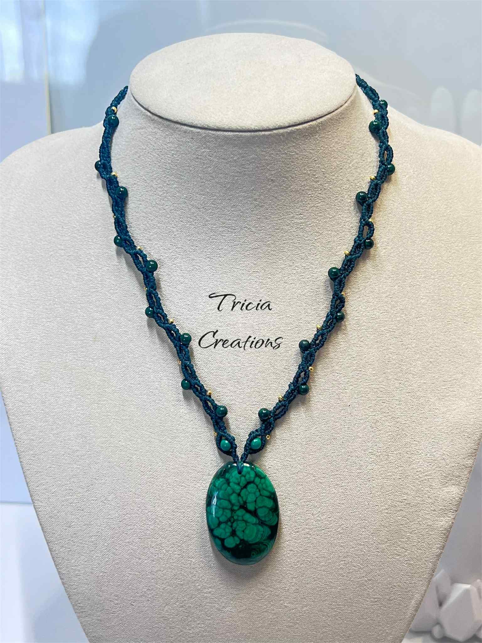 Ce collier en micro-macramé, réalisé en fil polyester ciré vert foncé, met en valeur un pendentif et des perles de malachite authentique. Les petites perles en laiton ajoutent une touche subtile d'élégance. Grâce à son fermoir nœud coulissant, vous pouvez ajuster facilement la longueur pour un porté personnalisé et confortable au quotidien.