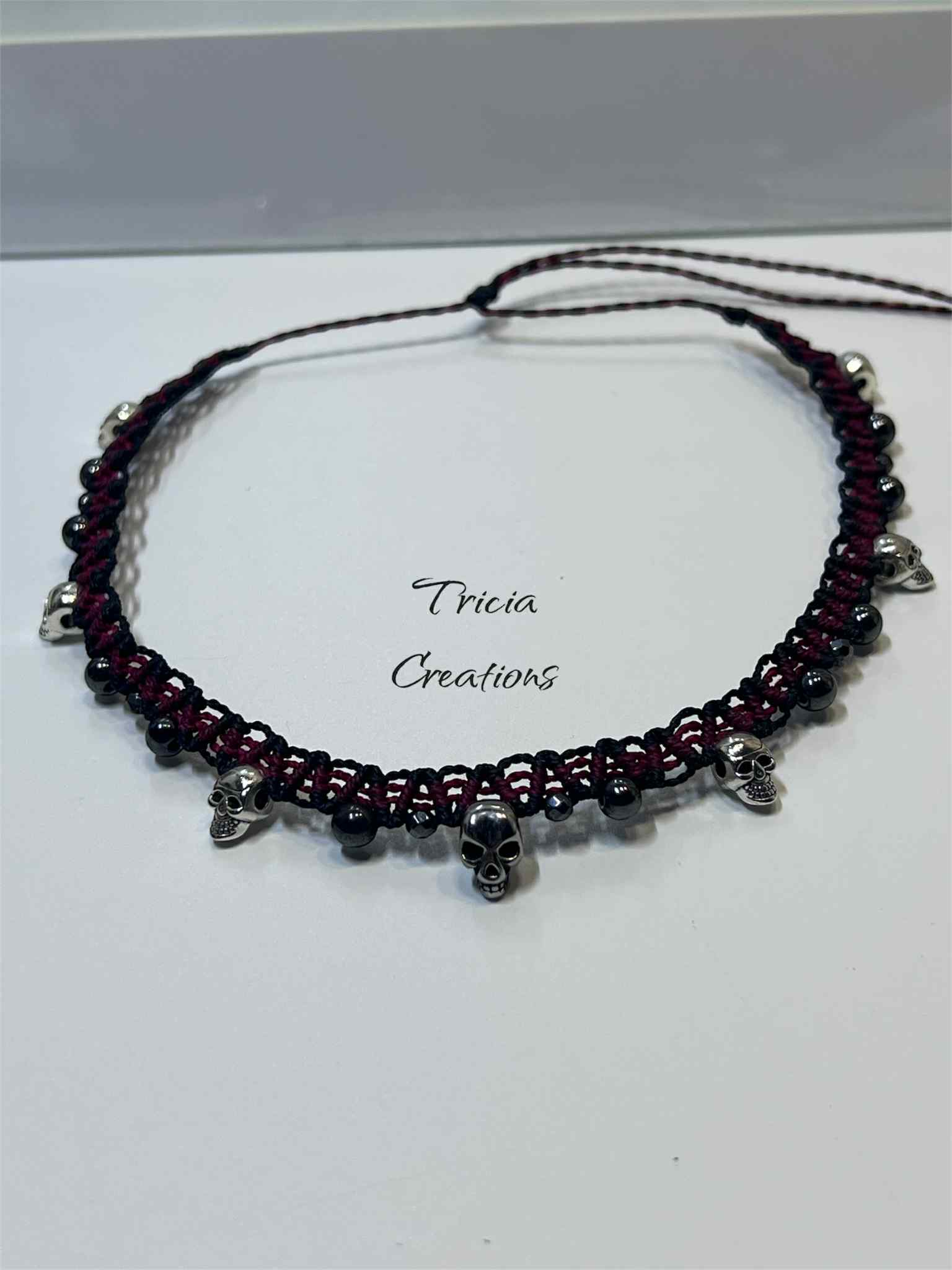 Collier ras de cou, micro macramé noir et bordeaux avec des têtes de morts en acier inoxydable et perles d'hématite. Le fermoir noeud coulissant permet un ajustement facile pour un confort optimal.