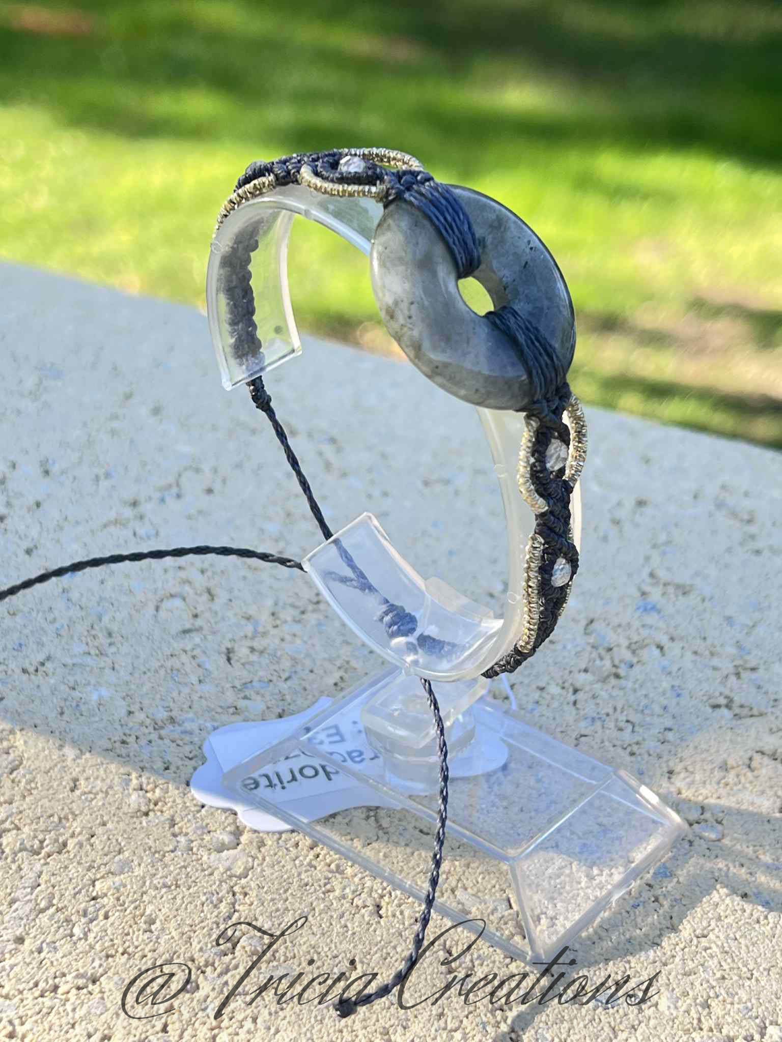 Ce bracelet en micro macramé allie finesse et élégance avec ses fils en polyester gris vert et doré. Orné d'un donut central et de perles facettées de labradorite, il offre une touche naturelle et apaisante. Le fermoir nœud coulissant garantit un ajustement confortable, idéal pour un porté au quotidien.