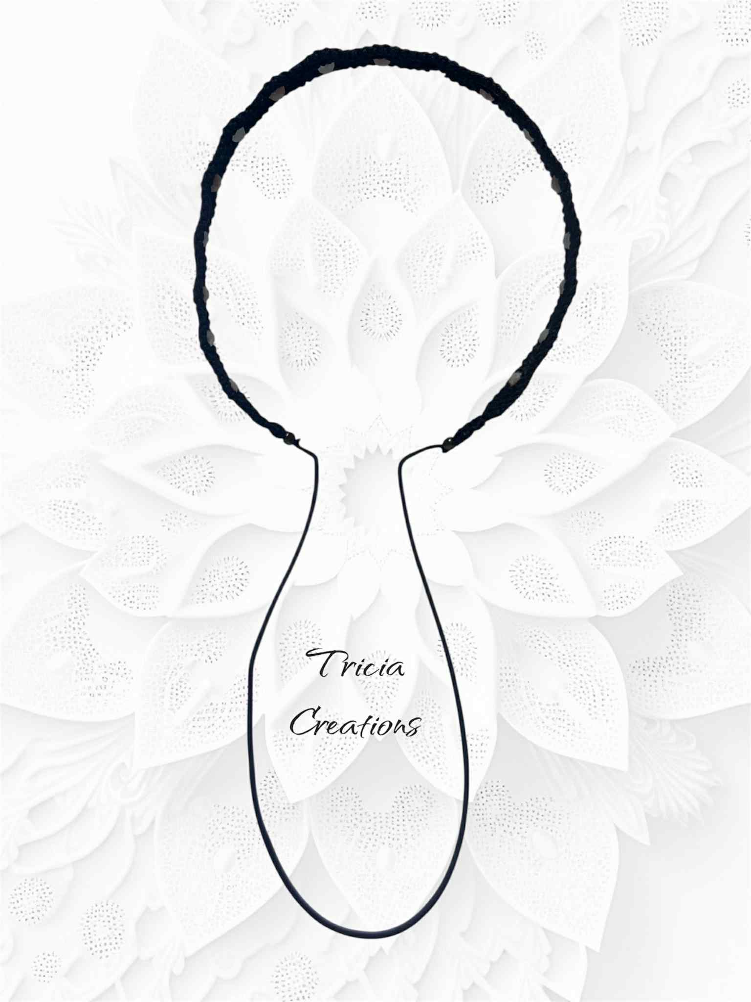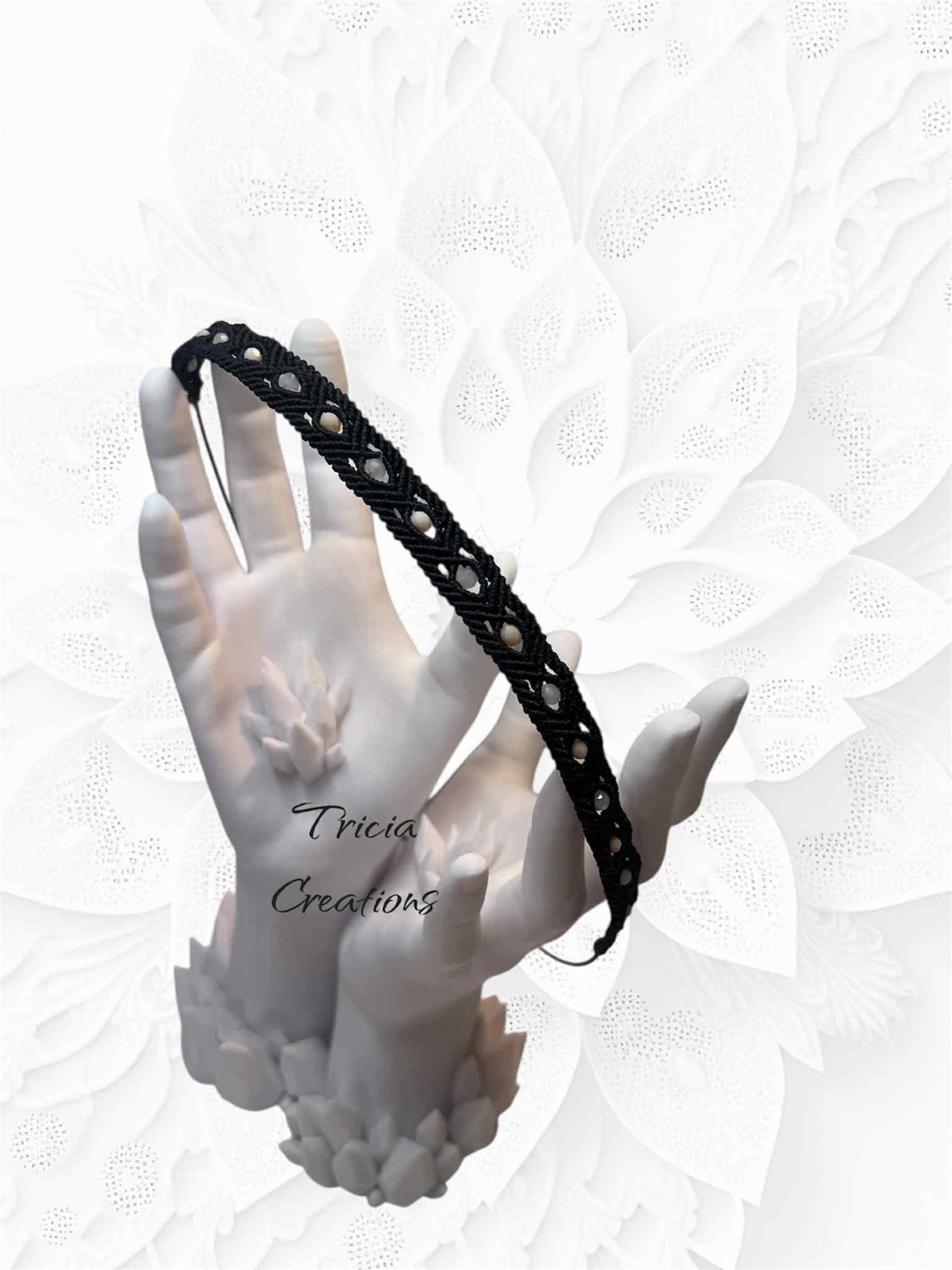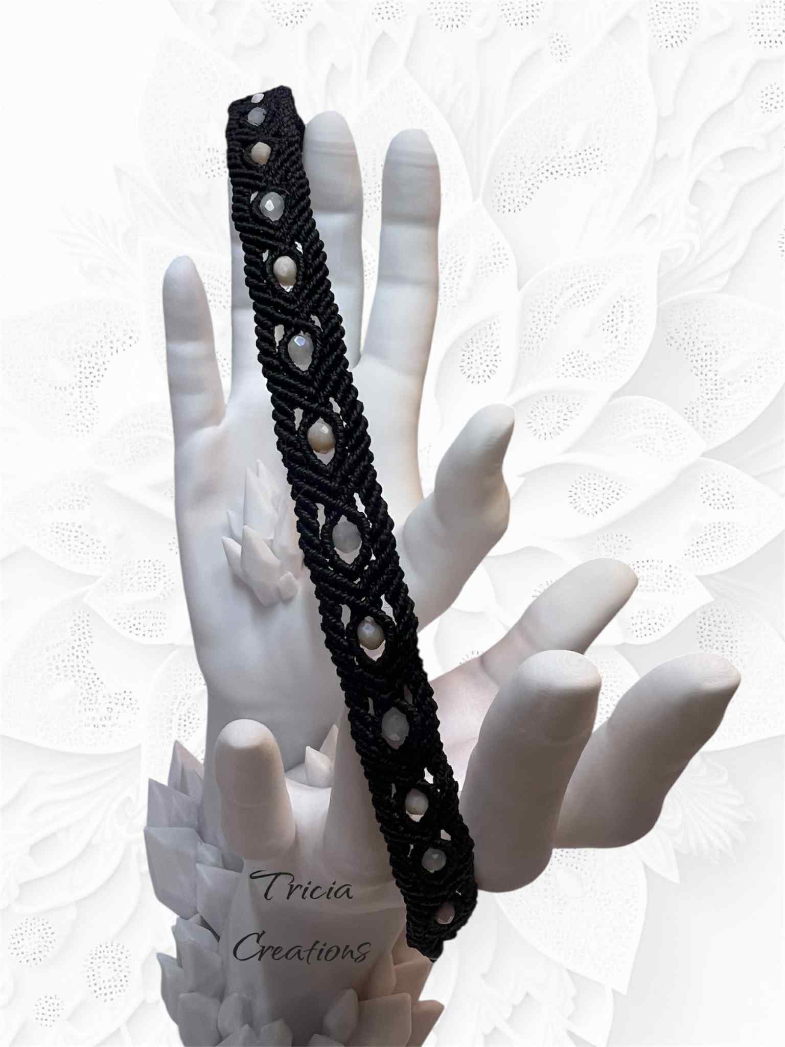 Serre-tête en micro macramé confectionné en fil polyester noir, orné de perles de verre facettées rose pastel et blanc nacré. L'élastique intégré assure un maintien confortable et sécurisé tout au long de la journée. Pièce délicate et raffinée, parfaite pour sublimer vos coiffures et ajouter une touche d'élégance à vos tenues.